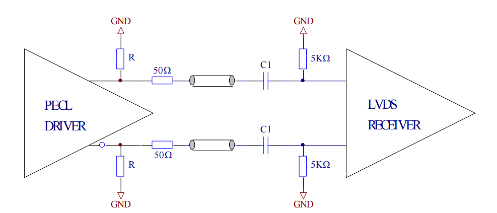(2)LVDS 到 PECL 的交流耦合结构如图 7 所示,分两种接法: 普通接法:需外部 R1(上拉至 VCC)、R2(下拉至地)提供偏置 简化接法:若 PECL 芯片内部集成偏置,可省去 R1、R2