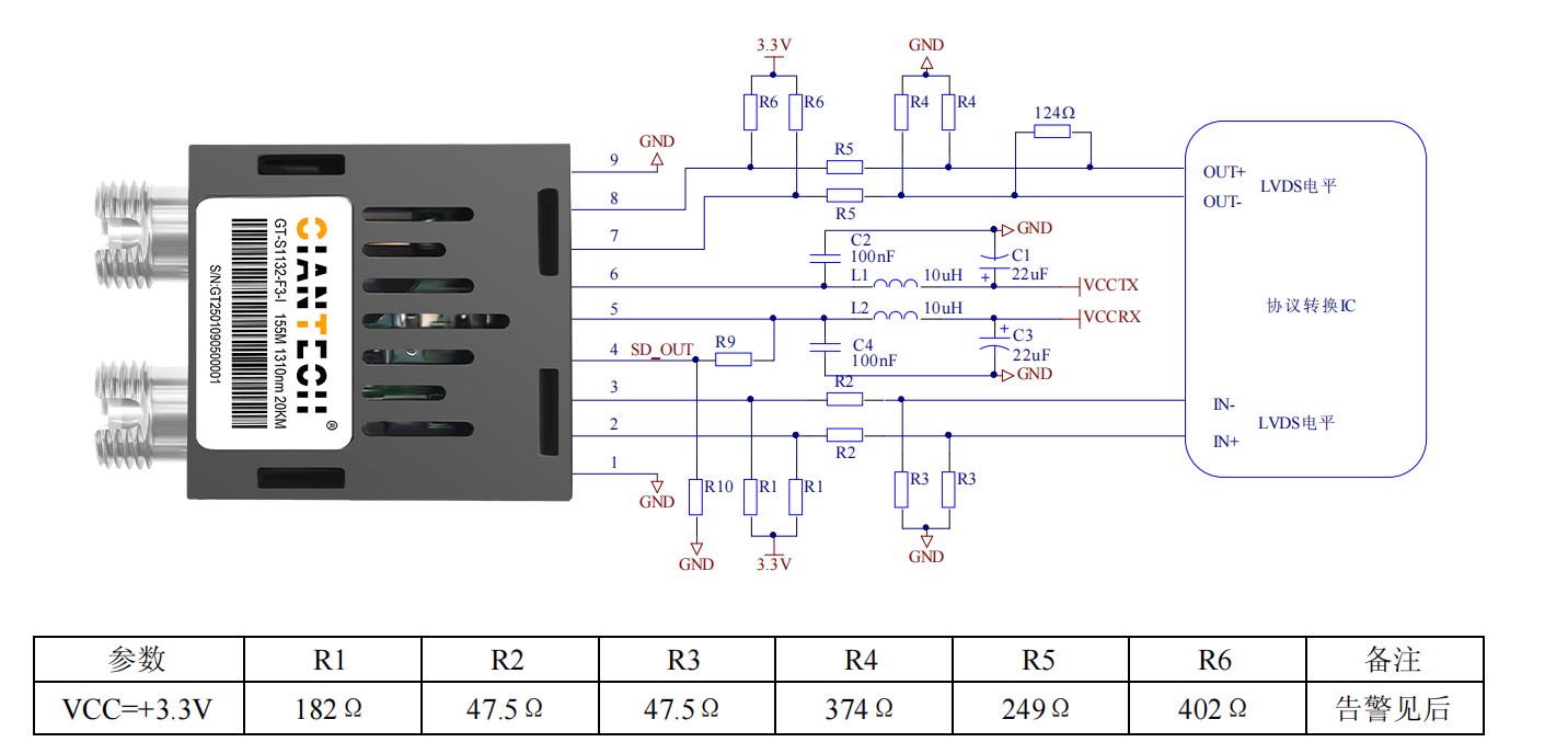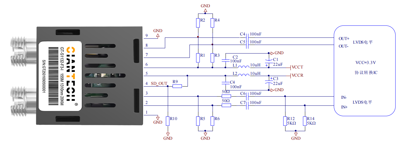 参数计算(3.3V 供电时): 解得 R1=374Ω,R2=249Ω,R3=402Ω,输入阻抗 RIN=49Ω(接近 50Ω),增益 = 0.62。 信号验证:LVDS 最小输出 500mVp-p 时,LVPECL 输入端为 310mVp-p(略低于 LVPECL 标准,实际需结合器件手册调整电阻值) (3)应用案例:光模块与协议转换 IC 的直流耦合在光模块(LVPECL 接口)与协议转换 IC(LVDS 接口)的互连中,直流耦合可减少延迟,适用于 10Gbps 以下速率场景。