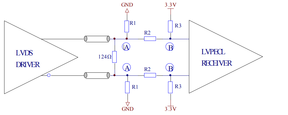 实测验证: 共模电压:VA=2.1V(LVDS 共模范围为 0.2V~2.0V,接近上限,需结合器件容限确认),VB=1.06V 信号摆幅:LVPECL 最小差分输出 930mV 时,LVDS 输入端为 313mV(满足 LVDS≥200mV 的灵敏度要求);**输出 1.9V 时,LVDS 输入 640mV(低于 LVDS **输入限制) (2)LVDS 到 LVPECL 的直流耦合LVDS 输出共模电压约 1.2V(以地为参考),而 LVPECL 输入共模电压需为 VCC-1.3V(3.3V 供电时为 2.0V,以 VCC 为参考),电阻网络需完成电平转换并抑制电源波动影响(如图 2 所示)。